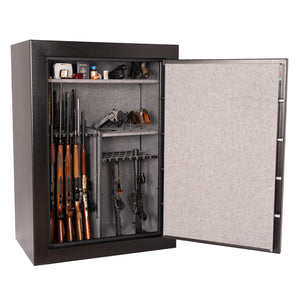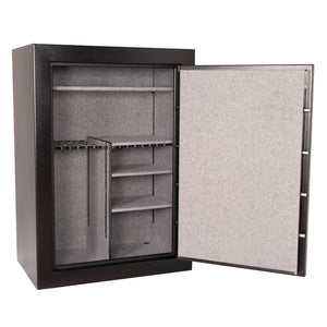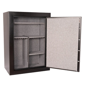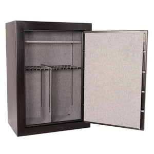 And fire protection? You’re covered. The E64 is rated for 30 minutes at 1200°F, with expanding fire seals and fireboard insulation on all sides, three layers in the door alone. Inside, you’ll find space for up to 64 long guns, a fully carpeted interior, and adjustable shelves to organize ammo or accessories. If you’re looking for that sweet spot between value and security, the E64 is a rock-solid pick.