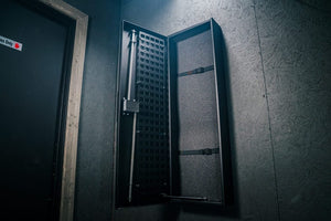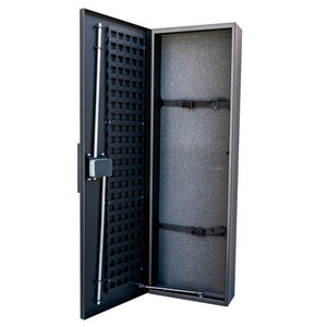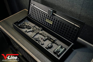 The construction of the V-Line Shotgun, Rifle, Tactical (SRT) Vault is a heavy duty 14 gauge steel. If you mount this safe horizontally, there is a damper for soft closure. Pre-drilled holes are in the back of this vault so that it can be mounted vertically or horizontally, depending on your needs. V-Line also builds this safe 100% in the USA in Simi Valley, California.