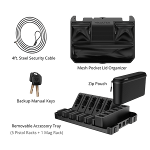 The Range Edition interior is configured specifically for pistol-heavy loadouts. A modular drop-in tray holds 5 pistols on dedicated racks with security straps, along with a magazine rack, while the reinforced lid organizer with mesh zip pockets keeps ear protection, cleaning supplies, tools, and range accessories organized and within reach the moment you open the case. Access is fast across all three methods: the weatherproof HD biometric scanner, the touch-sensitive Smart Sense keypad, or the manual backup key. The precision-engineered dual anti-impact latch system ensures the case stays locked until you decide to open it. A reinforced steel interior hinge system and included 48" steel security cable round out the anti-theft protection.