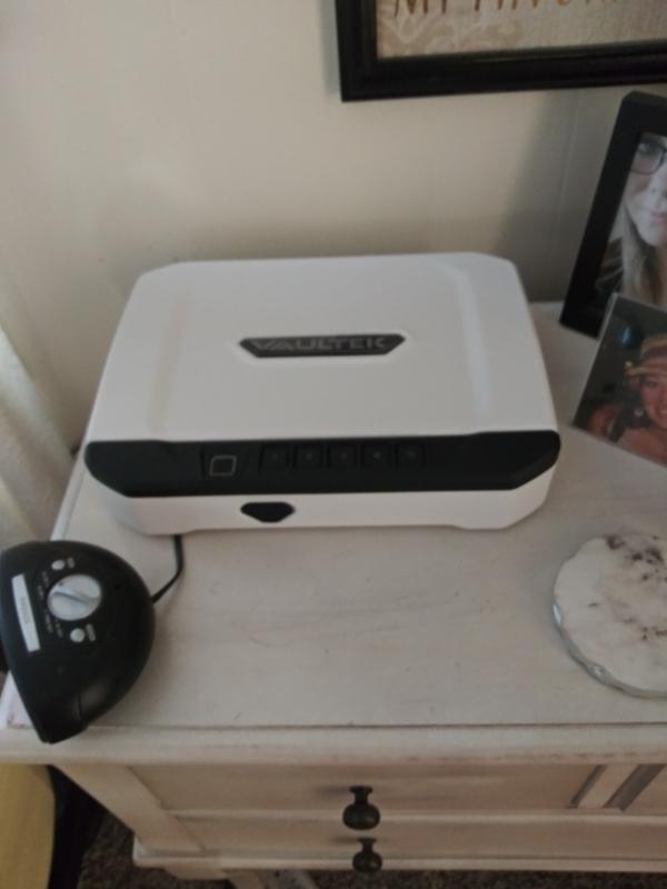 Great safe to have by your bedside. Love the bio finger print for speed. This safe will fit a full size hand gun! Alpine white makes a nice color for the top of a night stand.