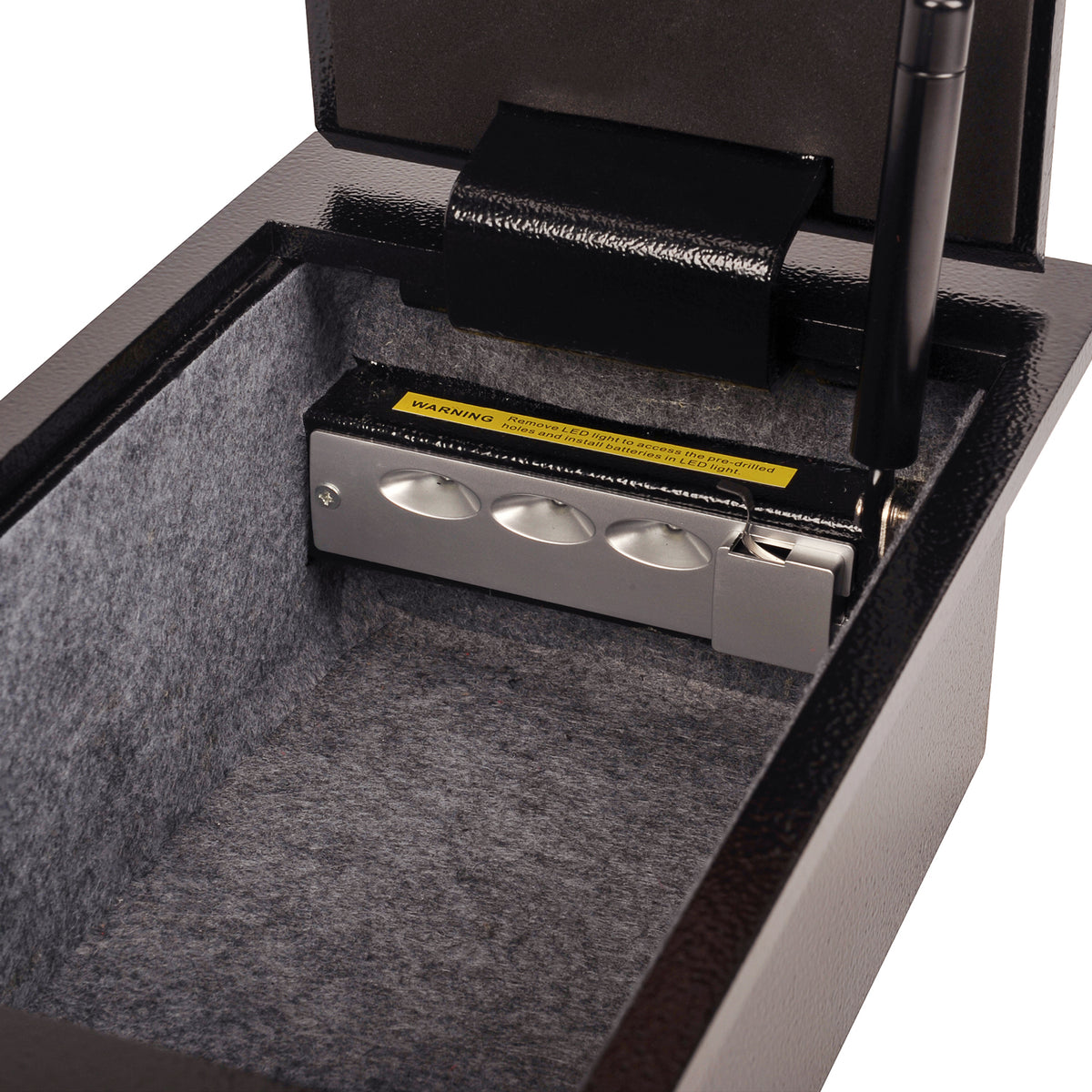 The safe interior is fully carpeted on all sides, offering a soft and protective environment for your valuable items. The lid is additionally covered with foam, providing extra cushioning and preventing any potential damage to your items. Experience quick and smooth access to your belongings with the hydraulic lift mechanism. Opening the door is a breeze, enabling you to retrieve or store your items conveniently and effortlessly.