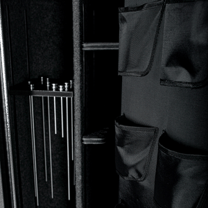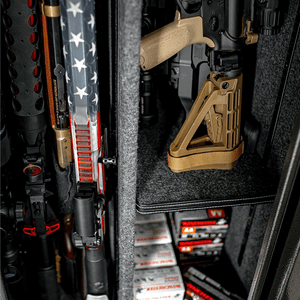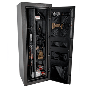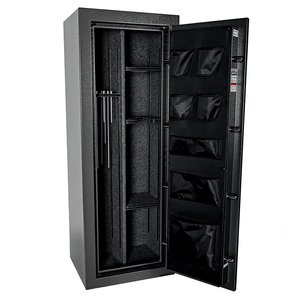 Distinguished by a slate gray finish and a chrome vault handle, the Bandit 14 Slate combines aesthetics with functionality. The interior features a door panel organizer, zippered pockets, and a power cord exit hole. This 60" x 22" x 18" safe is perfect for closets, with 8.19 cubic feet of interior space and accommodating up to 20 long guns.